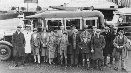 1931 Buscot Park outing to Bournemouth, taken at Bournemouth. Left to right: Bert Dancey, the estate carpenter; Tommy Clare in the white coat, proprietor of Eagle Coaches; Gladys Davis; Mrs Ruth Argent, the wife of the head forester; Margaret Dancey, Bert’s wife; Rev. Erward, Vicar of Buscot; a boy Edwards in front; Freddie Harris; behind him Mr Cyril Argent, the head forester; Mr Harry Sharps; in front of him Ernie Savory; Chum Hammond in a flat cap; Geoff Dancey, son of Bert and also a carpenter on the estate; Stan Sharps; Sid Rouse, carpenter; Rowland Dancey, son of Bert.