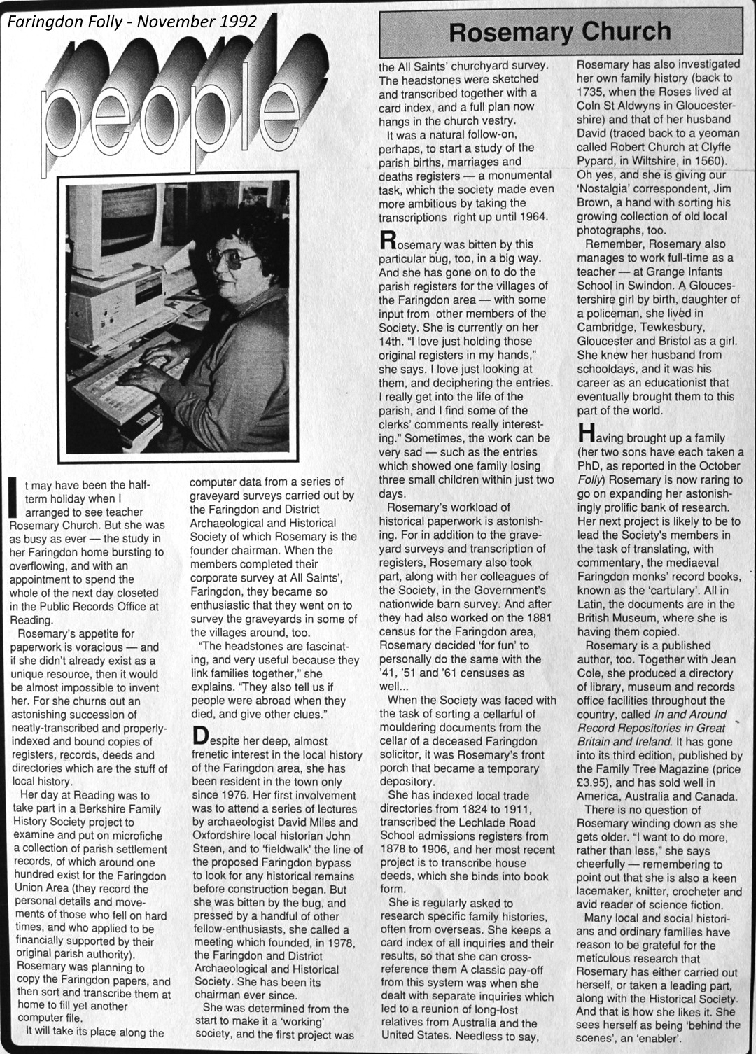 Rosemary moved to Faringdon with her family in 1976. The then proposal to build the Faringdon bypass grabbed her interest and urged her to go and search for any historical remains during its construction. Together with a handful of other fellow enthusiasts in 1978, Rosemary organised a meeting and founded the Faringdon & District Archaeological & Historical Society (FDAHS). Rosemary remained as chairman for the following 47 years, much of it while working full-time as a schoolteacher. During her time as chairman many projects were undertaken in order to help preserve the history of the town and surrounding area – see the above article from Faringdon Folly Newspaper for more details.